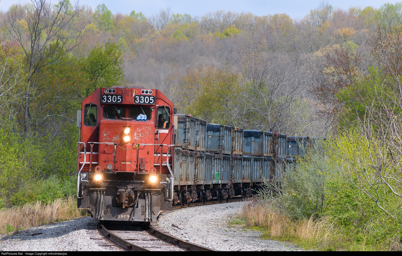 | With an ex-CP GMD SD40-2 in the lead, the Ohio Central's ZVNK crew brings a stone extra around the bend in Licking Township, Ohio as they head towards Zanesville. The block of trash cars at the head end will be dropped in town before taking the stone east. |
