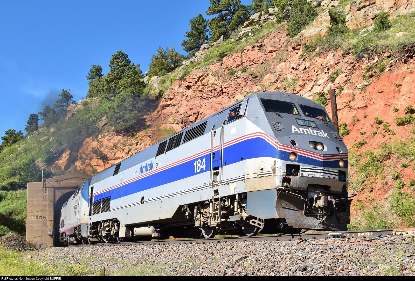 Amtrak heritage engine 184 (P42DC) leads the California Zephyr out of Tunnel 1 at Plainview, Colorado. A friendly wave and a horn toot from Engineer Gary was most appreciated!