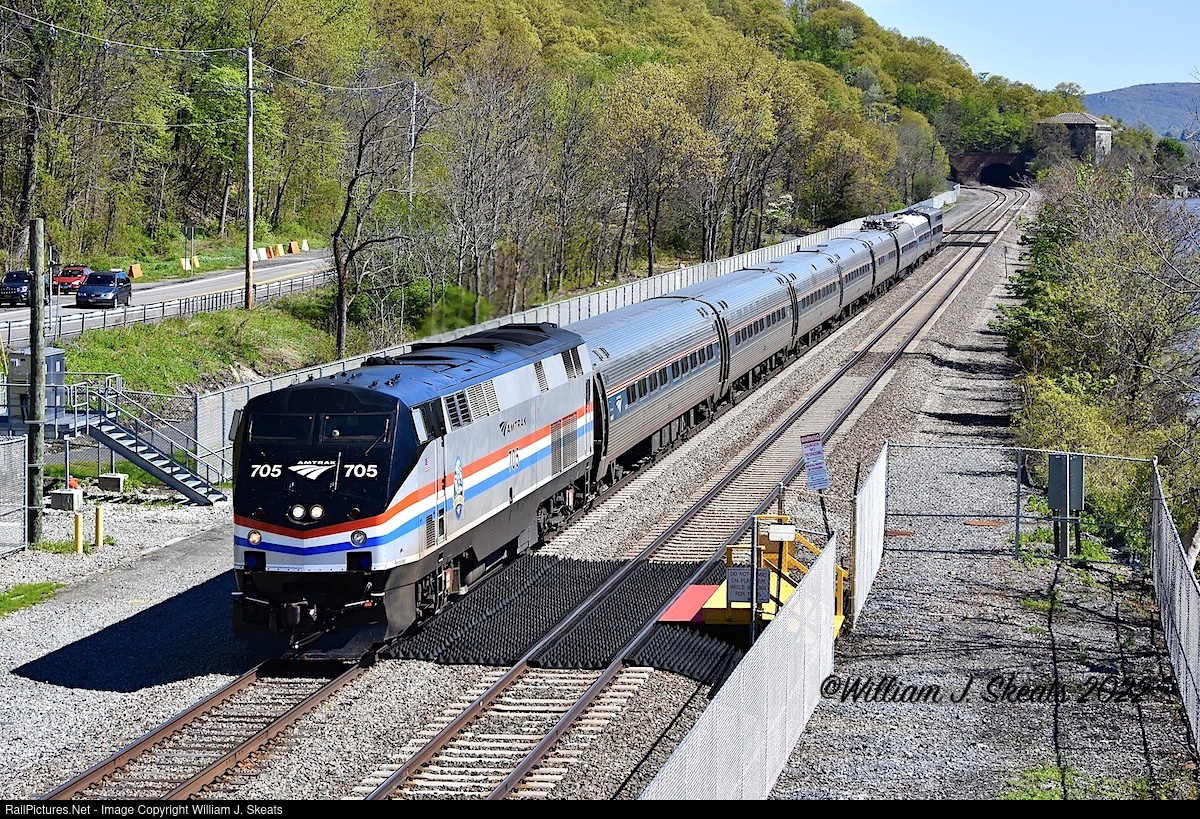 Amtrak's Ethan Allen Express Train 291 approaching the Pedestrian bridge on its way to Vermont. Inspection train today for Amtrak officials for the expanded service to Burlington, Vermont. P32AC-DM 705, 5 Amfleets, 10002 Corridor clipper, 10005, and 10004 American View.