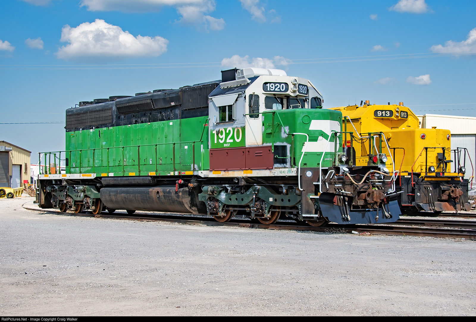 BNSF Railway SD40-2 1920 (ex-BNSF 6913; ex-BNSF 6913; née-BN 6336) sits outside Mid America Car, awaiting its turn going through the shop for rebuilding and repainting. (Kansas City, Missouri – June 19, 2022)