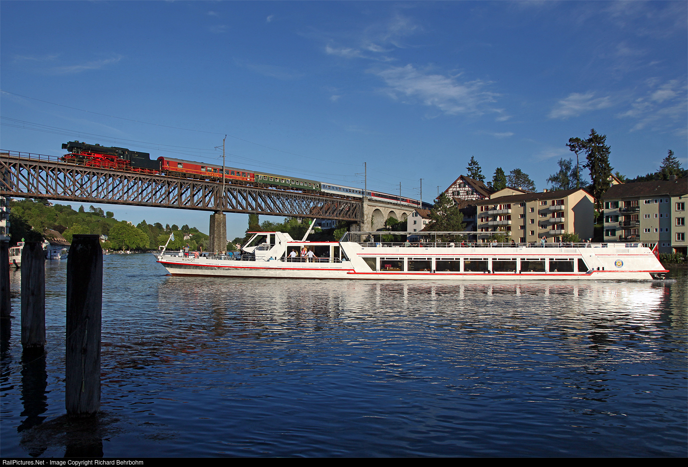 The 2-6-2 steam locomotive 23 058 of Eurovapor, built in 1955 by Krupp, is crossing the Rhine Bridge between Feuerthalen and Schaffhausen. The motor vessel "Munot" of the company Untersee und Rhein, constructed in 1998 by Bodan Werft Kressbronn, arrives after about four hours travel on the Rhine at its destination Schaffhausen.