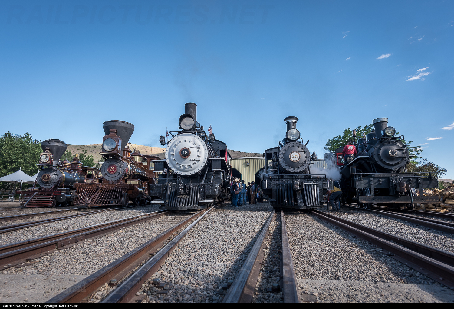 The Great Western Steam Up. From left to right: Baldwin class of 1875 "Glenbrook", Baldwin class of 1875 "J.W. Bowker", Baldwin class of 1911, S.P. #18, Baldwin class of 1905, V&T #25, Heisler class of 1916 Bluestone Mining #1. Everything in this photo (with the exception of "Bowker") was hot and under steam.