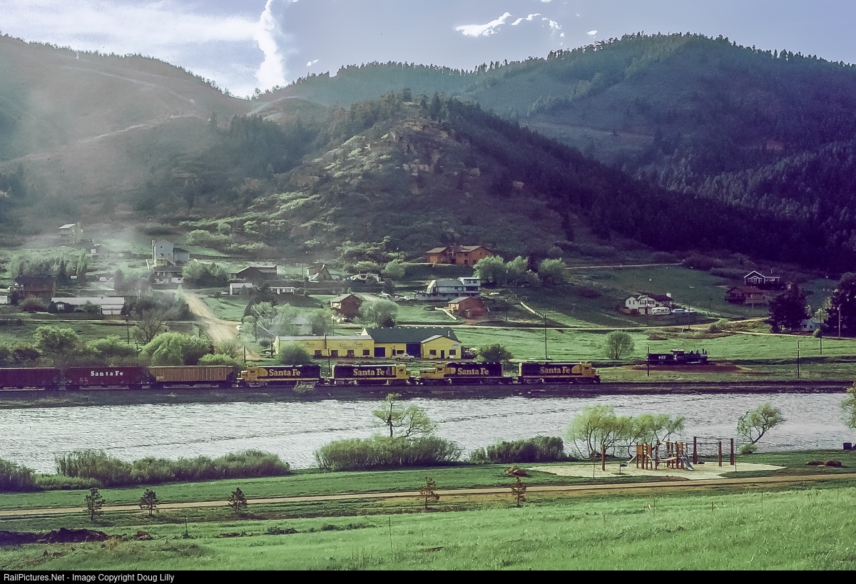 A Denver-bound Santa Fe manifest skirts Palmer Lake in the Colorado town of the same name. The power consist is unusual, having three four-axle GE’s. Another notable feature is “D&RG 433”, a 2-8-0 on display seen just to the right of the lead unit. The consolidation, which operated in Central America, is now on display at the Colorado Central Station Casino in Black Hawk, and is lettered “Colorado Central 71”.