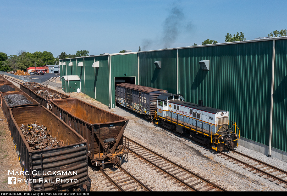 Pulling A Box Out Of A Box. Genesee Valley Transportation DL 1044 (née-South Buffalo 44, S6, Alco, 12/1956) is the regular power and that works the former Lehigh Valley and New York Central trackage of the Batavia division of the Depew, Lancaster and Western Railroad. Small in size but dense in customers, on the morning of Thursday, June 30, 2022, pulling a pair of box cars out of their warehouse was the last move before a lunch break. The crew had first switched out scrap cars in its own yard so that loading could take place while they headed up to the interchange with CSX and worked at several customers.