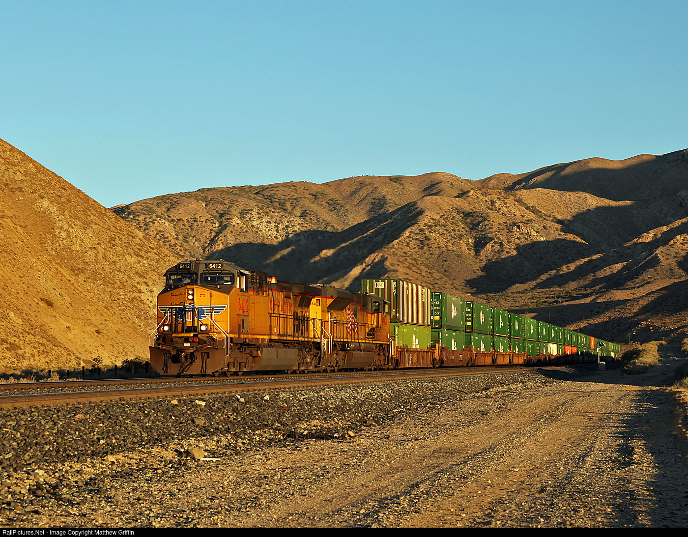 | Early morning shadows have just cleared, as a Southbound UP intermodal makes it's way out of the Tehachapi Mountains at Warren. |