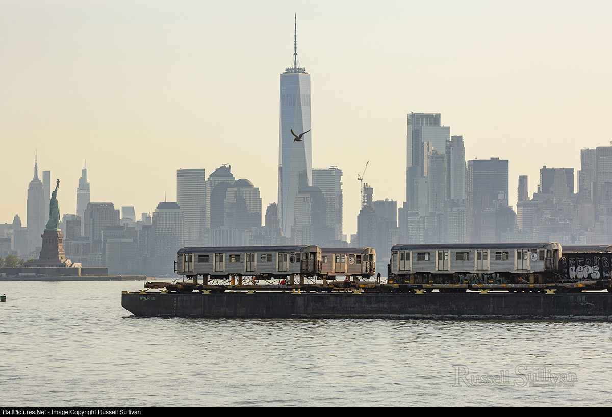 "Out to Pasture" Several Budd R32 subway cars hitch a ride across the New York Harbor on the New York and New Jersey carfloat heading for scrap in Ohio. The R32s were officially retired from revenue service in January of this year and started heading to be scrapped shortly thereafter.