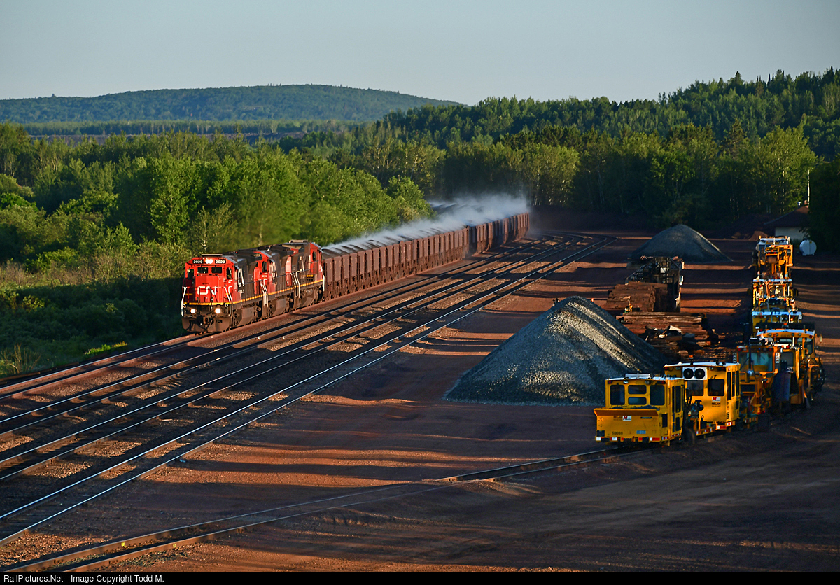 | Less than an hour after sunrise, CN 2029 is just about an hour into their trip to Two Harbors, MN with these steaming pellets made at Minntac and passing through the yard at Biwabik, MN. On the house track is tie gang equipment that's hanging out for the weekend. CN is spending money on maintenance and upgrades to the CN Iron Range sub this summer and those crews are making progress after starting in Two Harbors and making their way north. |