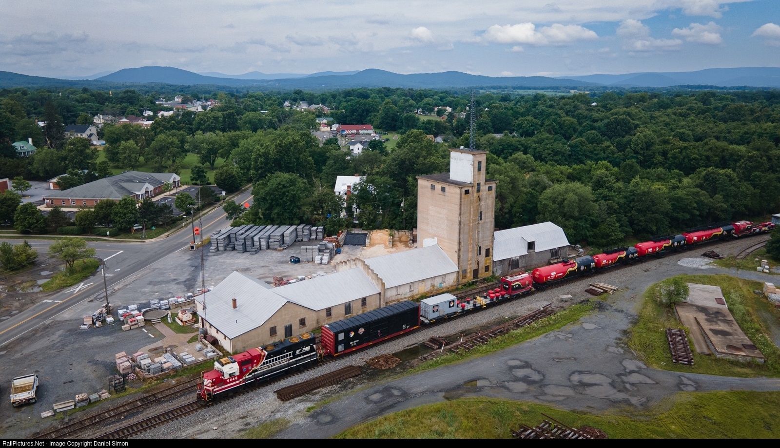Norfolk Southern's Operation Awareness & and Response (OAR) safety train rolls past the former Purina tower in Marshall, Virginia eastbound on the NS B-Line. Today, the train is heading to Alexandria, Virginia but not before tying down in Manassas.