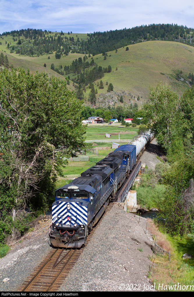| MRL's Night Gas local crosses the Jocko River, a Flathead River tributary, in Ravalli. Picture taken from the Highway 200 overpass. The train runs pretty much daily leaving Missoula in the late afternoon, running to Thompson Falls where a transfer is made to a pumping station and pipeline. An opposing gas train leaves Thompson Falls in the morning. |
