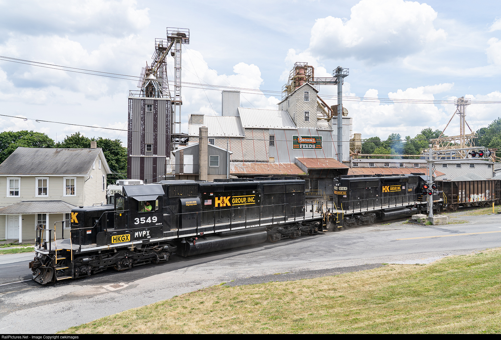 H&K Group, Inc.'s two new former Norfolk Southern SD40-2's have been hard at work since their arrival in February of this year. #3549 was built for the Burlington Northern before being acquired by FURX. It later became a part of NS's fleet before being sold at auction to MVPX. The trailing unit #6164 is a ex Norfolk & Western SD40-2. The pair are seen pulling a loaded aggregate train to the interchange track from the load out at Birdsboro Quarry, formerly Birdsboro Materials. In the background is the F.M. Brown's Birdsboro Feed Mill.