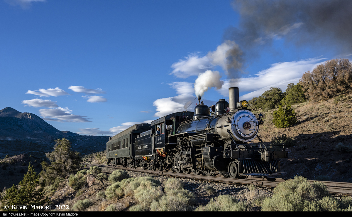 Last light at American Flat. On the evening of July 3, 2022, the Virginia & Truckee Railroad ran a special train for about 50 patrons, to help raise money for the restoration of the legendary V&T Locomotive #11 "Reno", which the railroad recently acquired and returned to Nevada. The train ride included a stop at the railroad's shops, where patrons could see the Reno's tender already under restoration, as well as several other projects in progress. The train then ran all the way to American Flat to a point just about half a mile north of Tunnel #2, so the passengers got a tour of much of the line. Observing that this section of the line would still be sunlit for a few more minutes, Railroad President Tom Gray asked if patrons would like to stop and take a photo of the train and of course, we couldn't refuse an offer light that. So, in the last light of day, here's V&T Consolidation #29 charging past the photo line, with the distant town of Gold Hill in the shadows behind it. And yes, this train is indeed heading toward Gold Hill, despite the fact that it appears to be headed in the opposite direction. This line was once referred to as the "Crookedest shortline in America", because there are enough degrees of curve in the run from Carson City to Virginia City to make something like 17 complete circles. That's a lot of curves!