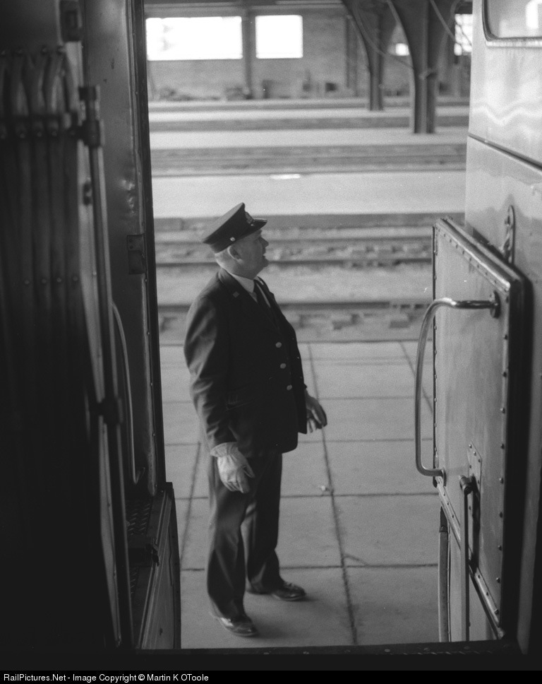 Conductor checks the vacant platform before giving the high ball to the southbound Floridian. Yaschica Mat 124-G; Plus-X