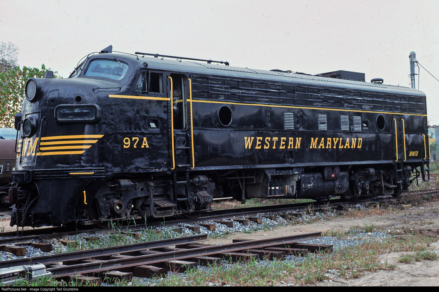 “Don’t Judge a Book…” “WM”/MMID 97A (ex-MILW 97A), attired in Western Maryland speed lettering, rests at the Union Bridge shops on a Sunday in mid-October, 1985. Despite its listing on the MMID roster, and the MMID reporting mark, the FP7 was actually owned by a private group, and leased to the Maryland Midland.