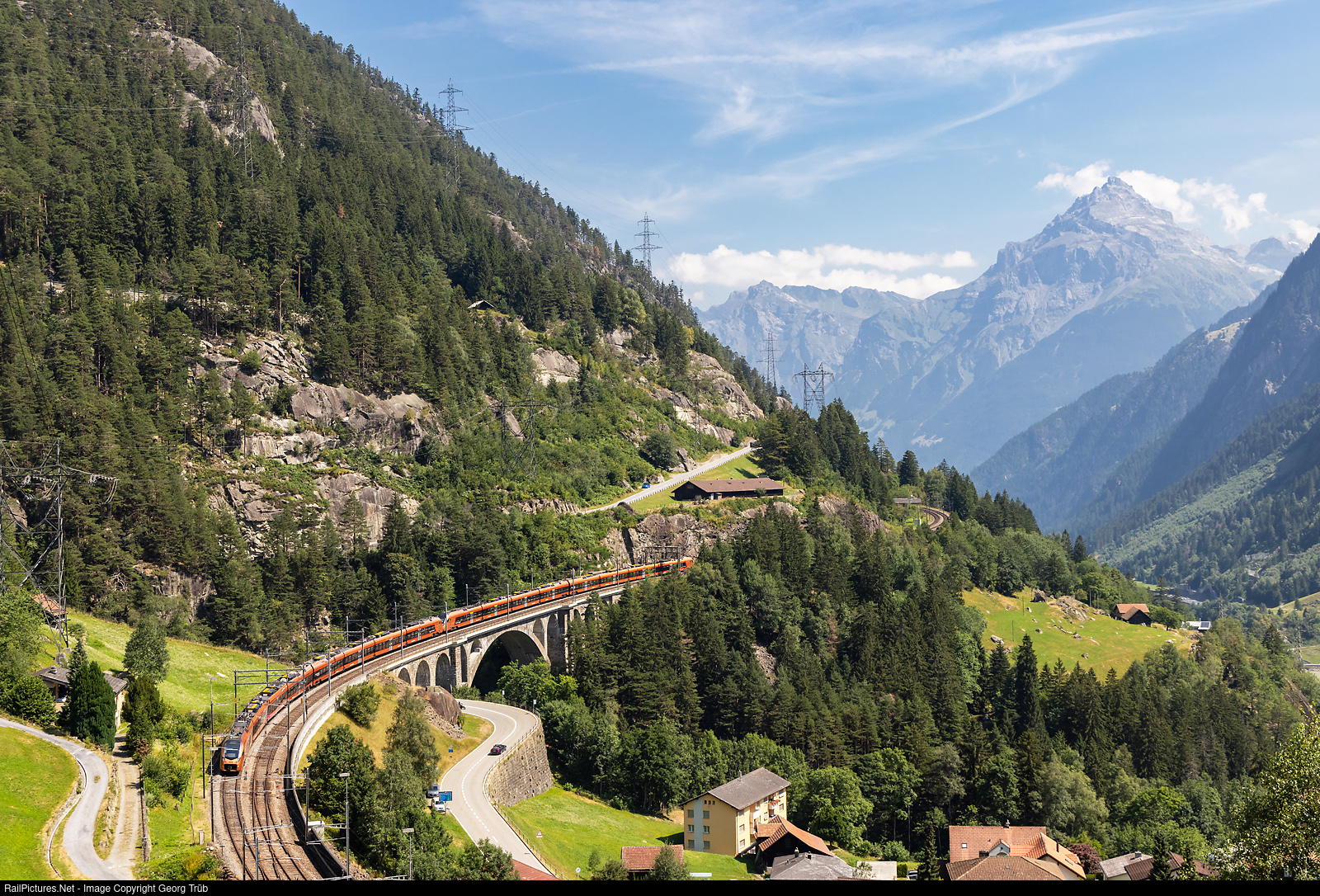 | Two "Traverso" trains of the Südostbahn (SOB) in multiple control are running the IR 2417 "Treno Gottardo" of the line IR 46 from Zürich over the Gotthard mountain line to Locarno over the middle Meienreuss bridge in Wassen. RABe 526 # 219/119 and # 216/116 are running this train. The second "Traverso" will uncouple in Göschenen, because the platforms on most stations in the Leventina are too short for this 300 meter long train. The train is reinforced for the transport of scouts on the way to the large camp "Mova" in Ulrichen/Valais. The participants will travel from Göschenen to Andermatt by post car or trains of the Matterhorn-Gotthard-Bahn, from Andermatt to Ulrichen by extra trains of the MGBahn. |