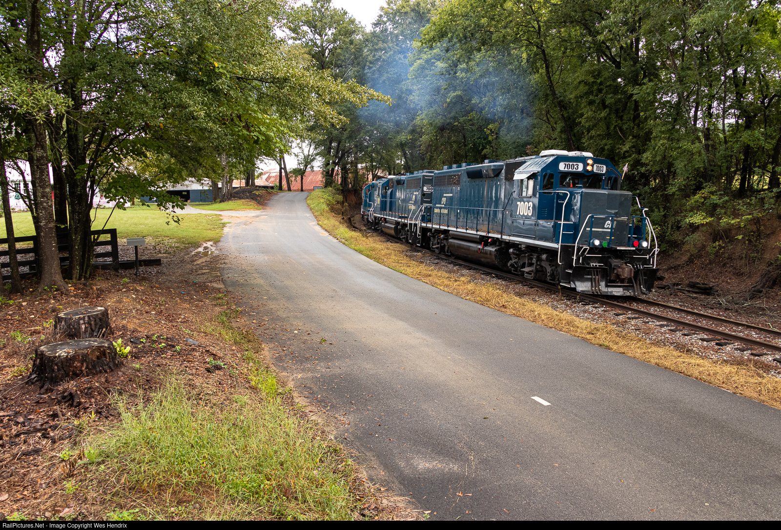 | Three CaterParrott Railnet GP40-3 locos lug a heavy mixed train south as they depart Madison, GA on the railroad's F Line to Machen. There the train will interchange the cars to Norfolk Southern who in turn will take them to Brosnan Yard in Macon (not Machen) to be sorted. |