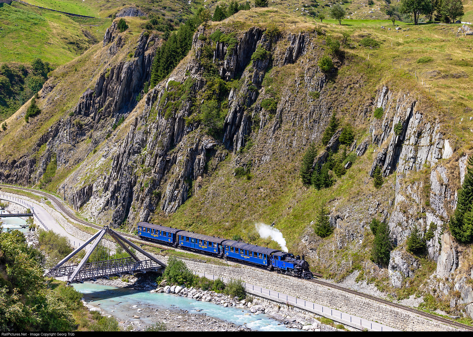 Cogwheel 2-6-0 T steamlocomotive HG 3/4 # 1 of the Dampfbahn Furka Bergstrecke is pulling the "Blue Train" 134 from Gletsch over the Furka pass to Realp, through the gorge of the Furkareuss near Realp. Between Oberwald and Gletsch, the train was pulled by diesellocomotive HGm 4/4 # 61 of the MGBahn due to high fire risk. The locomotive was built in 1913 by the SLM Winterthur for the Brigue-Furka-Disentis (BFD) railway and ran for the successor Furka-Oberalp-Bahn (FO) from 1926. When the line was electrified, the locomotive was sold to Indochina (later Vietnam) in 1947, together with sisters # 2, # 8 and # 9. Brought back to Switzerland in 1990. Since 1993 operational for the Dampfbahn Furka Bergstrecke after a large revision in Meiningen/Germany. Now a major overhaul is needed and the locomotive will run for the last time for a few years in September this year. The locomotive will undergo a major overhaul at the DFB workshop in Uzwil.