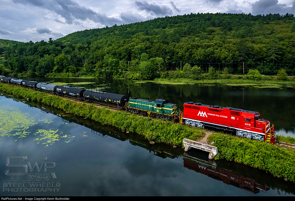 Vermont Rail System-painted GP38-2 209, the first of 8 on the 2022 paint list to receive the rebranding, is seen on the DASW, Bellows Falls Switcher, as it is shoved by the GMRC Alco RS-1 405. The 209 was to be enroute to Burlington for traction motor work, however a few more decals need to be applied and it was recalled to the paint booth following these shots on August 9.