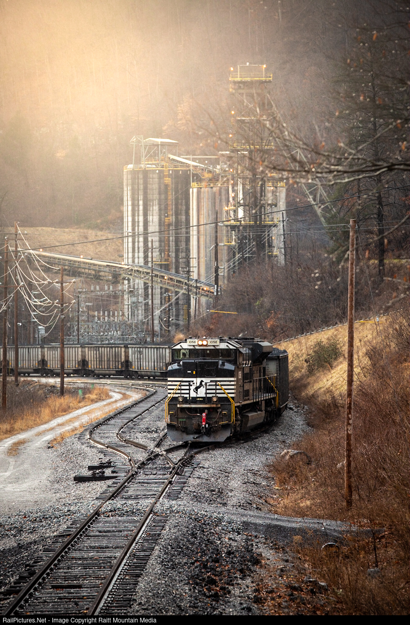 | The sun pokes out for just a second during an otherwise rainy day as J78 keeps air on the first cut of coal loads. Just down the holler, U53 floodloads the second cut at the loadout known to the railroad as Consol.