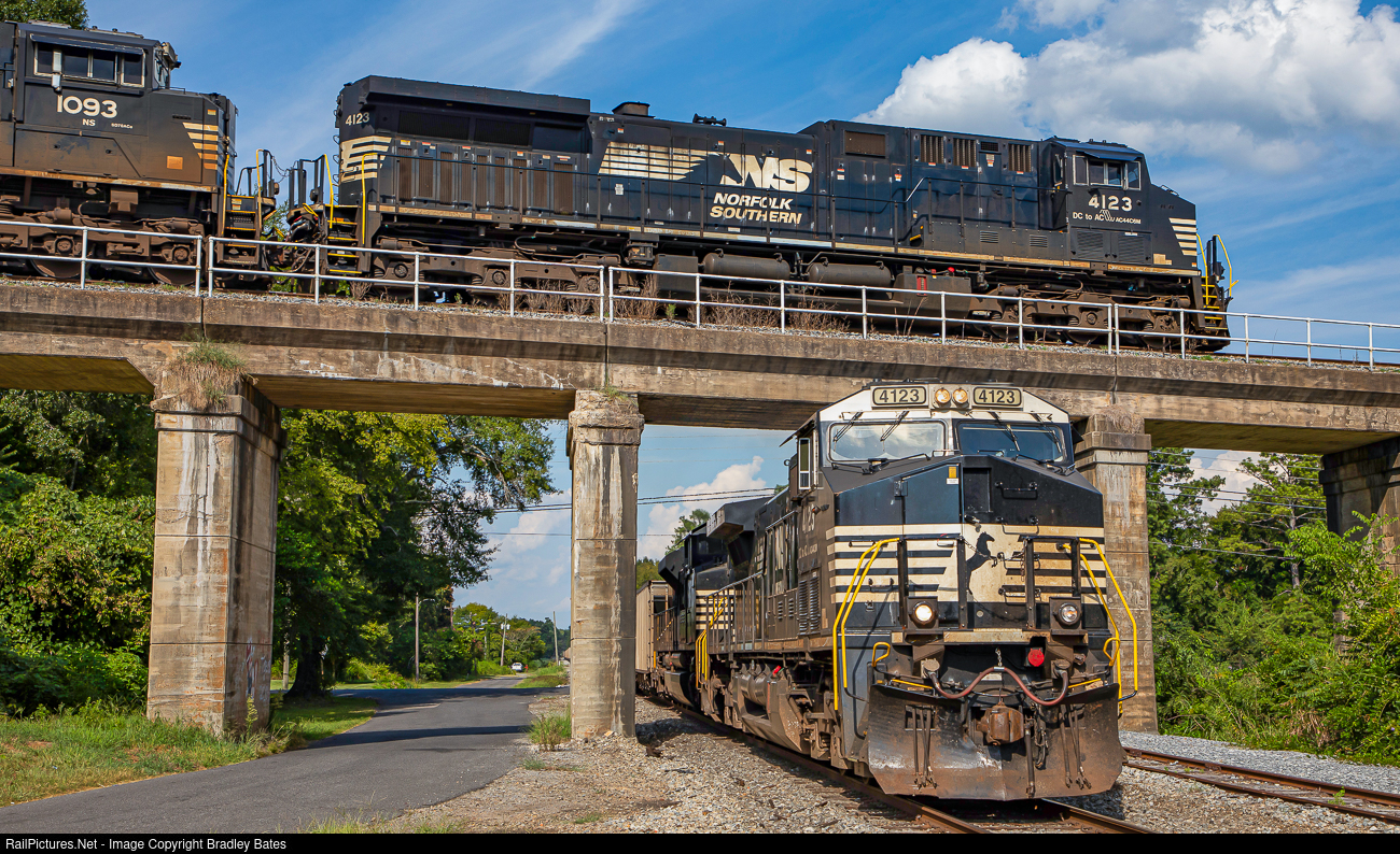 The chance of me seeing the same locomotive on two different trains within an hour of each other going over and then under are zero, but the chance of me seeing the same locomotive on the same train going over and then under, 100%. On Saturday August 13th, 2022 at 3:50 PM, Norfolk Southern Eastbound loaded Coal Train 74G crosses over the Anniston District on the Central Of Georgia in Childersburg, AL., heading for Bon Air about a mile ahead to shove down the N-Line connection track. An hour later the same Train can be seen heading south for the Gaston Steam Plant in Wilsonville as they pass underneath the CofG on the Anniston District. Obviously this photo is a layer of two separate images taken an hour apart.
