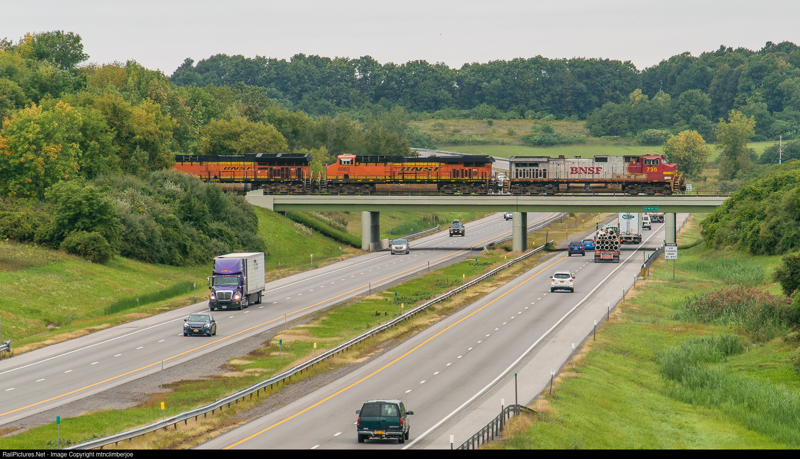 | A trio of BNSF GE's lead loaded CSX oil train K138 as it rolls east over the New York State Thruway in Batavia, New York with a BNSF lettered warbonnet in the lead. The train was interchanged from BNSF in Cicero and is bound for refineries on Philadelphia's east side for processing. |