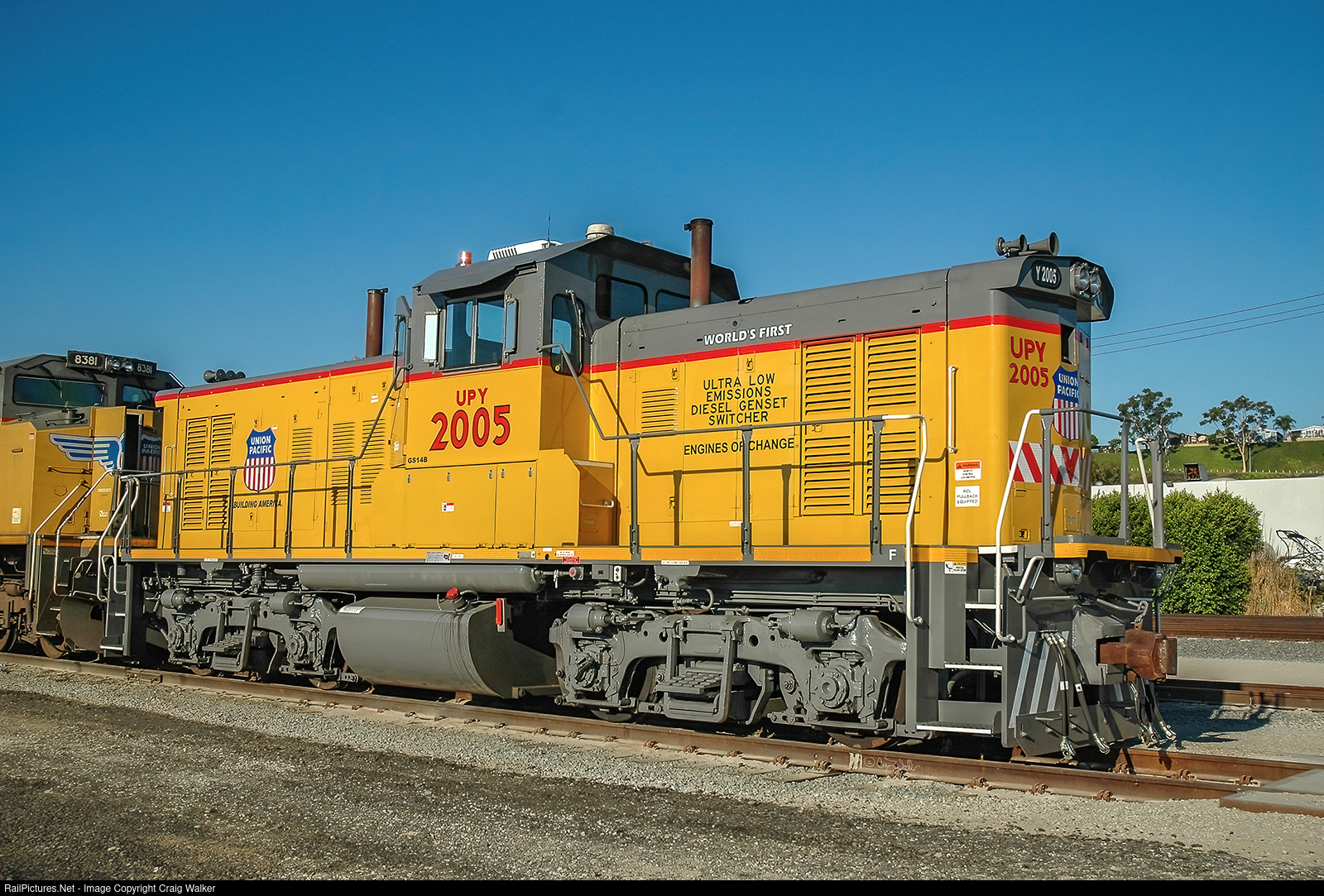 Southern Pacific MP15DC 2690 was rebuilt by National Railway Equipment into a "Truck Engine Switcher" (TES), or GS14B. A pair of Cummins 700hp truck engines are under the hoods of this unique locomotive, UPY 2005, seen at the Union Pacific’s Dolores Yard. (Compton, California – August 19, 2010)