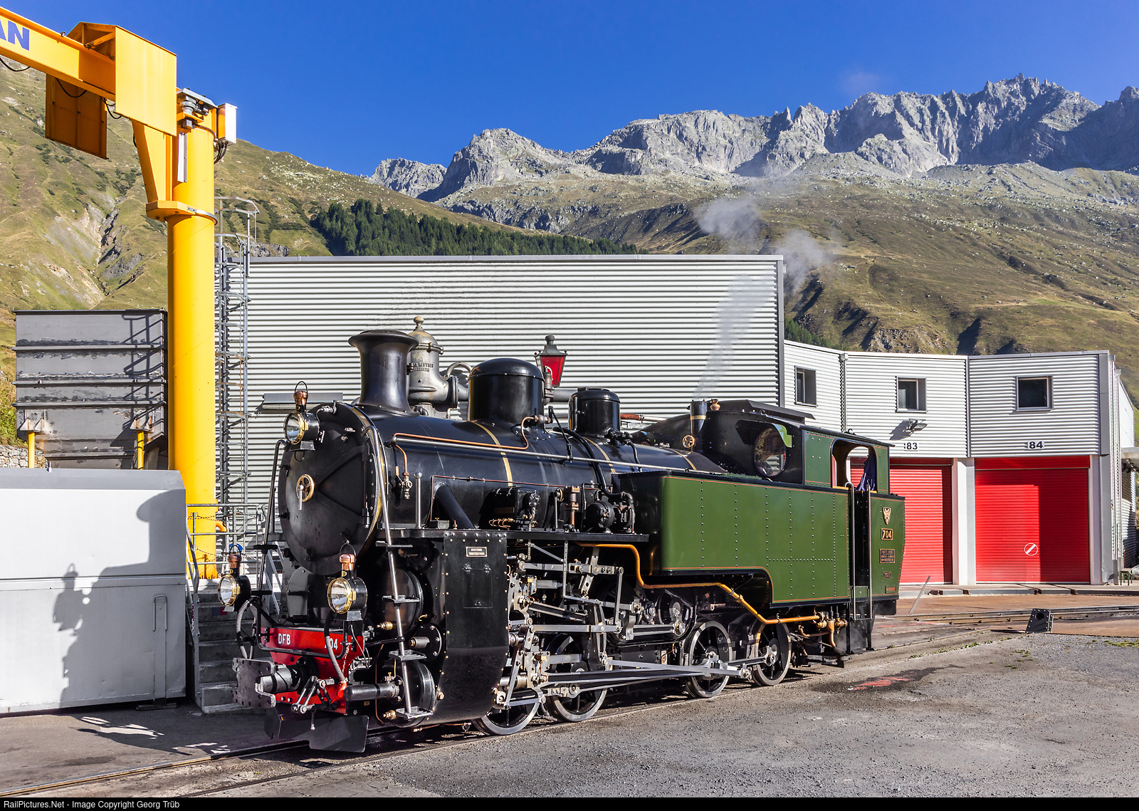 Masterpiece from the SLM Winterthur in the depot Realp of the Dampfbahn Furka Bergstrecke. The 0-8-0 T cogwheel steamlocomotives of type HG 4/4 were procured in nine copies from 1923 onwards by the French colonial administration for use on the rack railroad from Song Pha to ?à L?t in French Indochina (today Vietnam). The rack-and-pinion locomotives built by Schweizerische Lokomotiv- und Maschinenfabrik Winterthur (SLM) were taken directly to France and on to Asia, where they remained until the line was abandoned due to the war in the 1970s. Two machines, which were returned to Switzerland in 1990, have been preserved at the Dampfbahn Furka-Bergstrecke (DFB), one of which is still being refurbished. At the time the locomotives were designed, SLM was able to draw on extensive experience in the construction of rack-and-pinion locomotives. The basis for the HG 4/4 was the HG 4/5 rack-and-pinion locomotive with the Winterthur drive system delivered to the Nilgiri Railway in India in six units in 1914 and in another four in 1920. The power output was again significantly increased, and the design without running axles made it possible to use the total mass of the vehicle as a frictional weight. The maximum drivable gradient was 120 ‰, the trailer load on adhesion and cogwheel sections was to be a maximum of 65 tons. SLM had already built the locomotives HG 2/3 and HG 3/4 (Abt system) earlier.