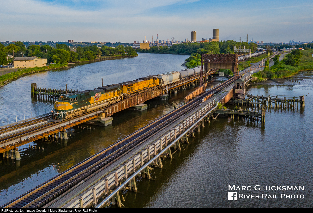 Not The Yellow We Expected. On August 17, 2019, CSX K603-17 (Philadelphia, PA - Bensenville, IL) was led by Union Pacific Railroad 1995 (Chicago & North Western/C&NW Heritage, SD70ACe), seen crossing Overpeck Creek into Ridgefield Park, New Jersey with the NYC skyline in the background. This unusual visitor had brought loaded ethanol cars on K602 several days prior and was returning the empties. The bridge in the foreground carries trains of the New York, Susquehanna, and Western Railway, whose corporate scheme is yellow and black.
