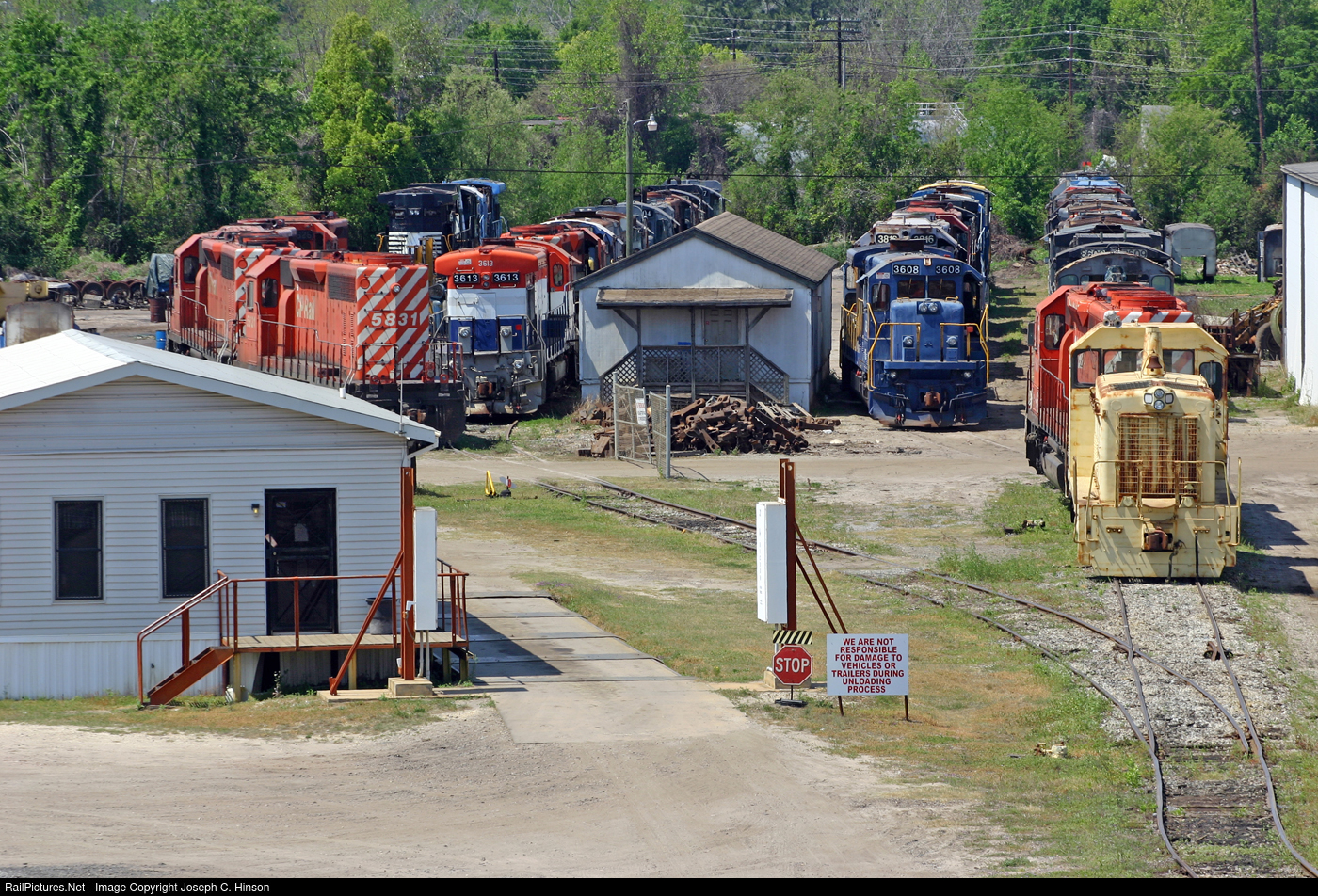 A bevy of old locomotives await an uncertain fate on the grounds of Progress Rail Services in Waycross back in 2007. Many of these train engines have no doubt been scrapped in the intervening dozens years. The engine nearest us is an old Illinois Central SW14, no known visible number.