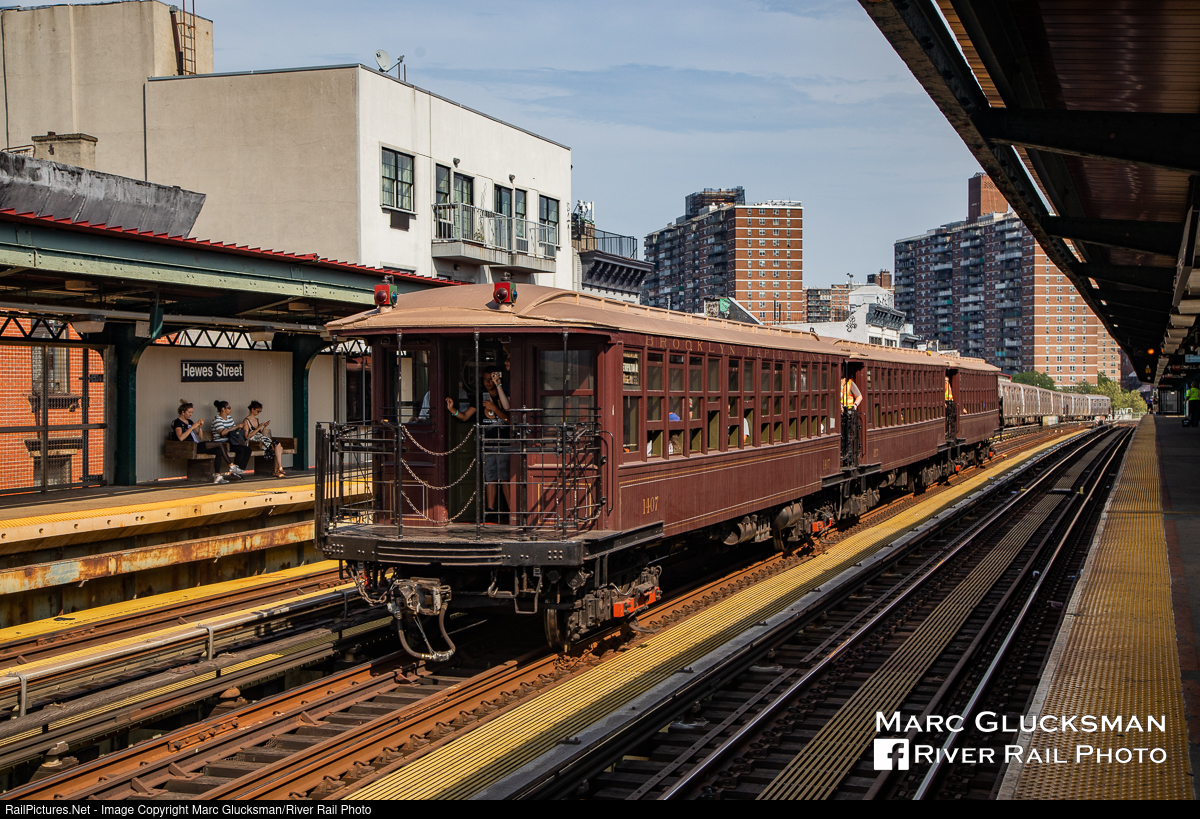 Elevated On Elevated. A Metropolitan Transportation Authority - MTA NYCT Subway/New York Transit Museum Nostalgia Special was operated on August 18, 2019 to commemorate the end of service on the Myrtle Avenue Elevated between Broadway and Jay Street on October 4, 1969. The first section opened on April 10, 1888, and today the remaining portion of the line operates today between Metropolitan Avenue and Myrtle Avenue. Brooklyn Union Elevated car 1407 (Jewett/Pressed Steel, 1907) led a 3-car train (1407-1273-1404) over this portion of the route of the former Myrtle Avenue Elevated, seen passing through the Hewes Street Station. Today it operates as the “M” line and is a full y integrated part of the NYCT Subway system.
