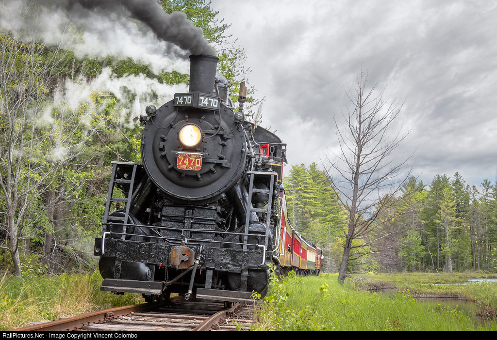 | In May 2014, the Mass Bay RRE coordinated a photo special featuring ex-CN 7470 before the locomotive went out of service for an FRA inspection for 4.5 years. The special toured the Conway Branch to Conway, and the Mountain Subdivision between Redstone and Notchland. Here, 7470 is seen at Pudding Pond in Conway on the Redstone Branch/Mountain Sub. The charter was cut short for 7470 after an overheated bearing was discovered in Bartlett en route back to North Conway. |