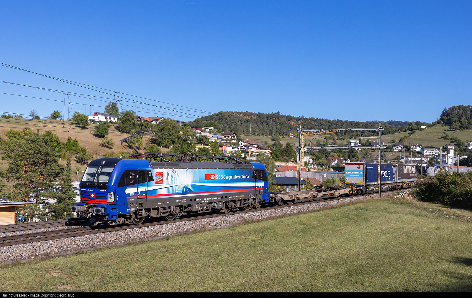 Siemens "Vectron" 193 # 518 "Ticino", in publicity paint scheme for "Ceneri 2020", of the Südleasing GmbH, Stuttgart, rented to SBB Cargo International, is pulling the northbound intermodal train 42018 from Gallarate via Luino-Gotthard-Base Tunnel-Basel to Köln Eifeltor, at Zeihen between Effingen and Hornussen on the Bözberg north ramp.