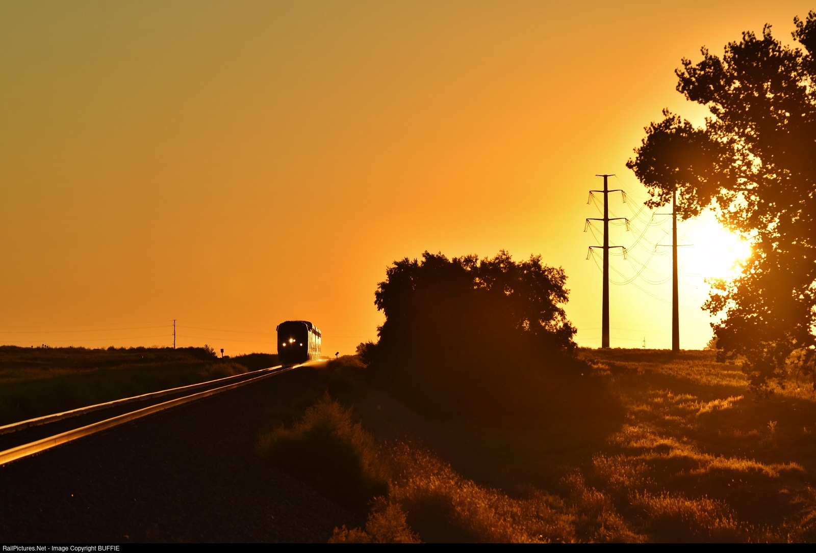 A bright orange sunrise bathes the California Zephyr in a warm glow as it runs through Hudson, Colorado on the Brush Sub.