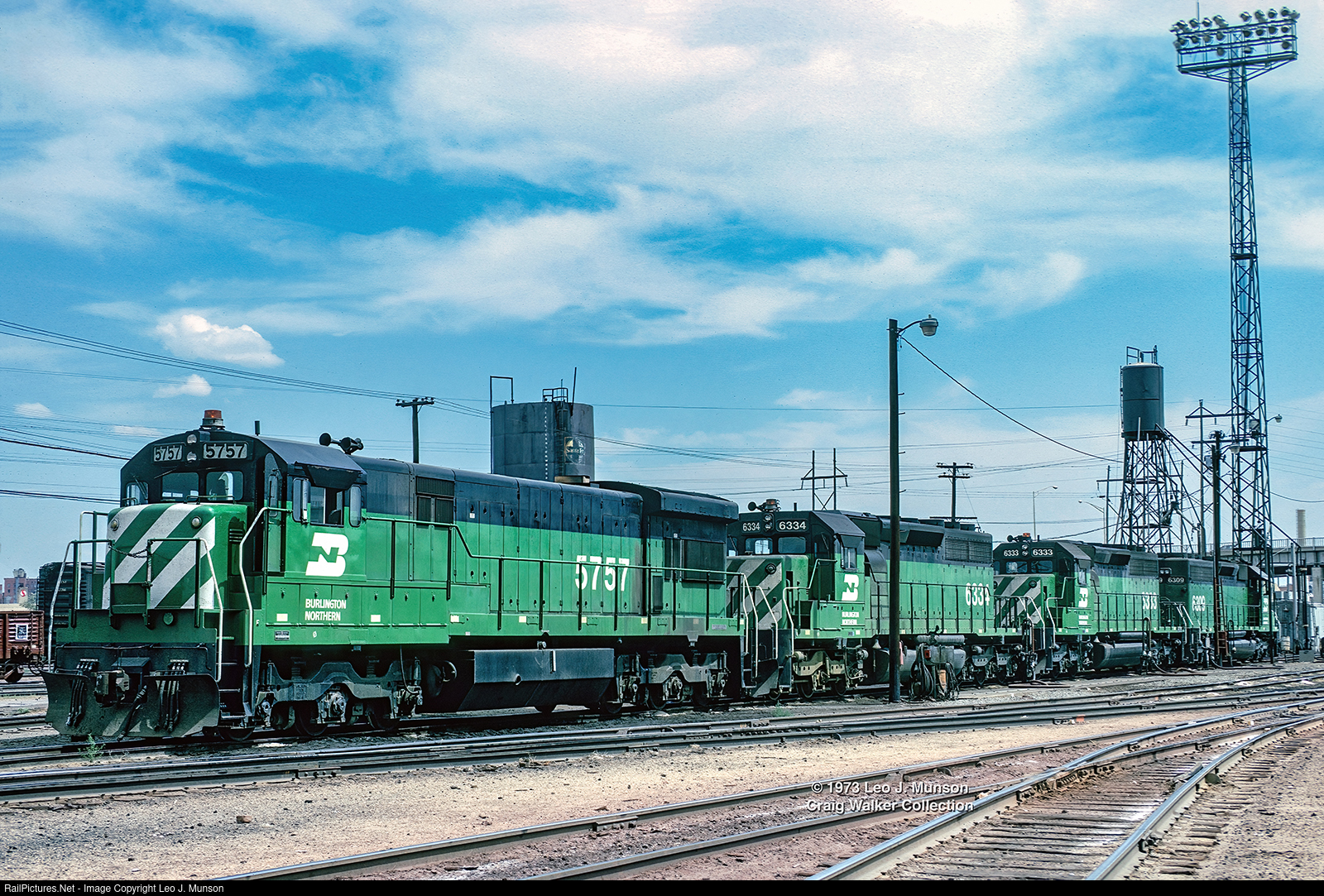 A quartet of Burlington Northern Railroad locomotives (U33C 5757, SD40-2s 6334 and 6333, and SD40 6309) await their next assignment at the joint Atchison Topeka & Santa Fe / Colorado & Southern yard in Pueblo, Colorado, on August 28, 1973. (The C&S is a subsidiary of the BN.) Leo J. Munson photograph, Craig Walker Collection