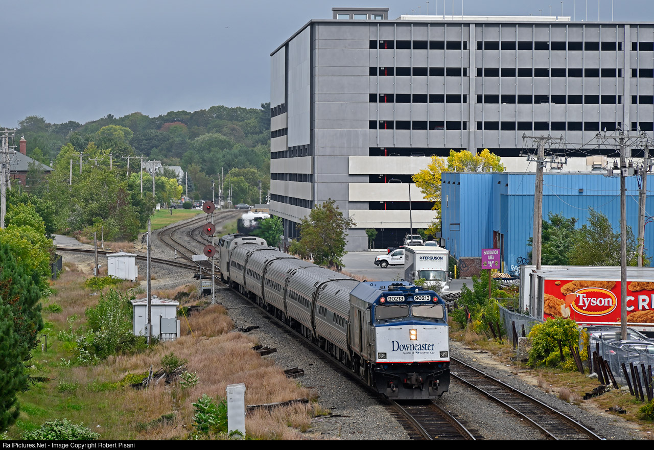 | Amtrak Downeaster 681 reverses off the connecting track that leads to Portland's train station. After clearing the interlocking the train will continue north to Brunswick, ME. The NPCU comes in handy for this move and allows the conductor to protect the shove from the comfort and safety of a cab.