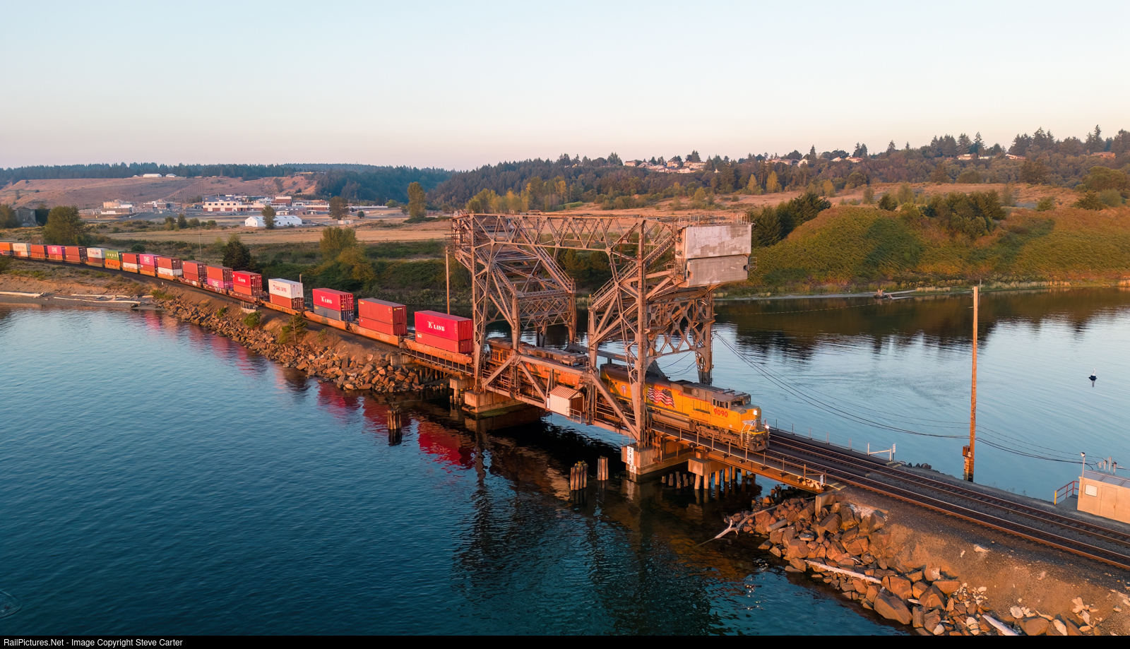 | Its near high tide at Chambers Bay on the Puget Sound, and near sunset as well, for the crossing of Bridge 14 by this south bound UP stack train. |