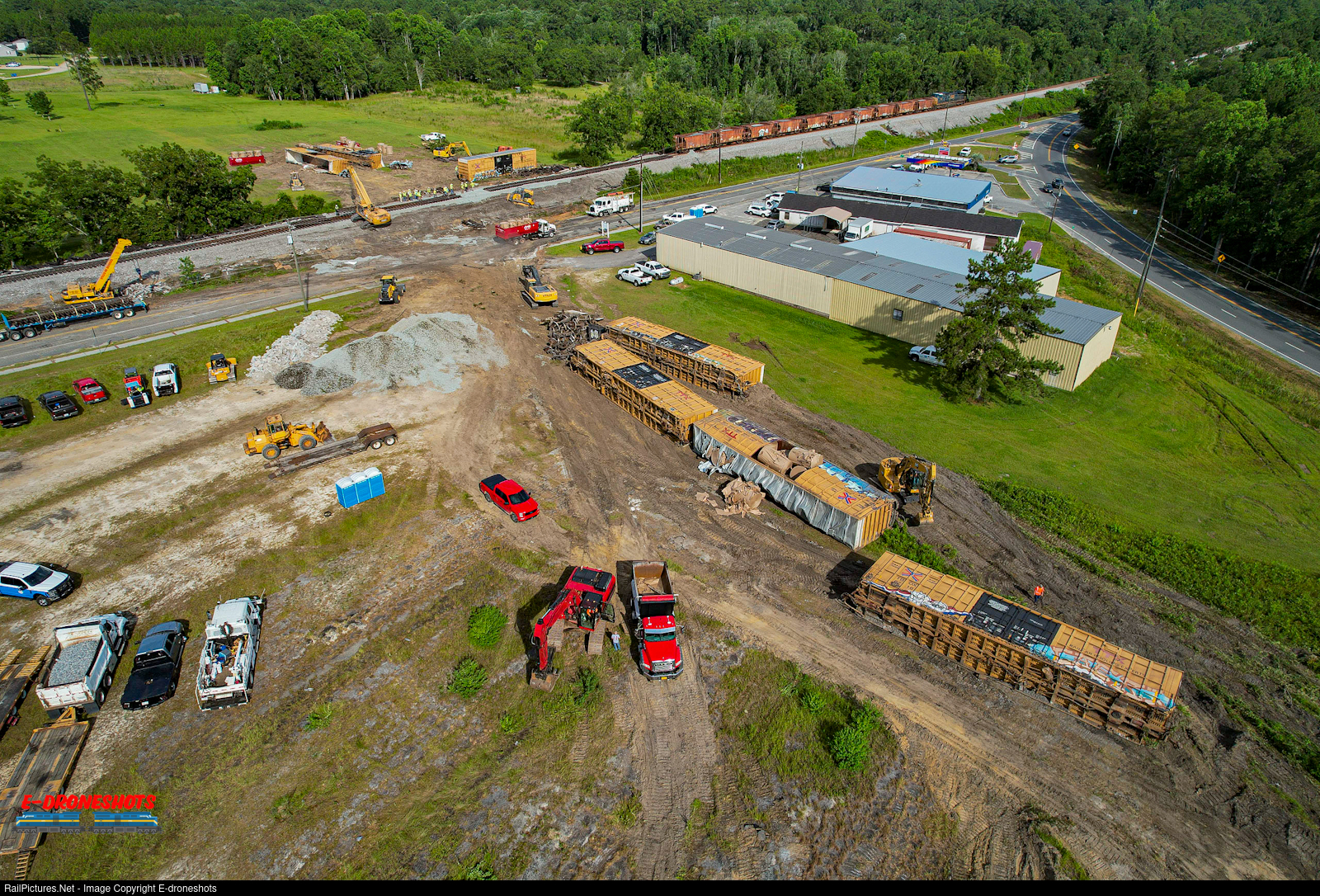 The aftermath of a major train derailment near Waycross gives us a view of a rail car graveyard. No injuries reported for this incident. It is common practice to utilize open areas for derailed equipment near a derailment site for clean up purposes to re-open the line.
