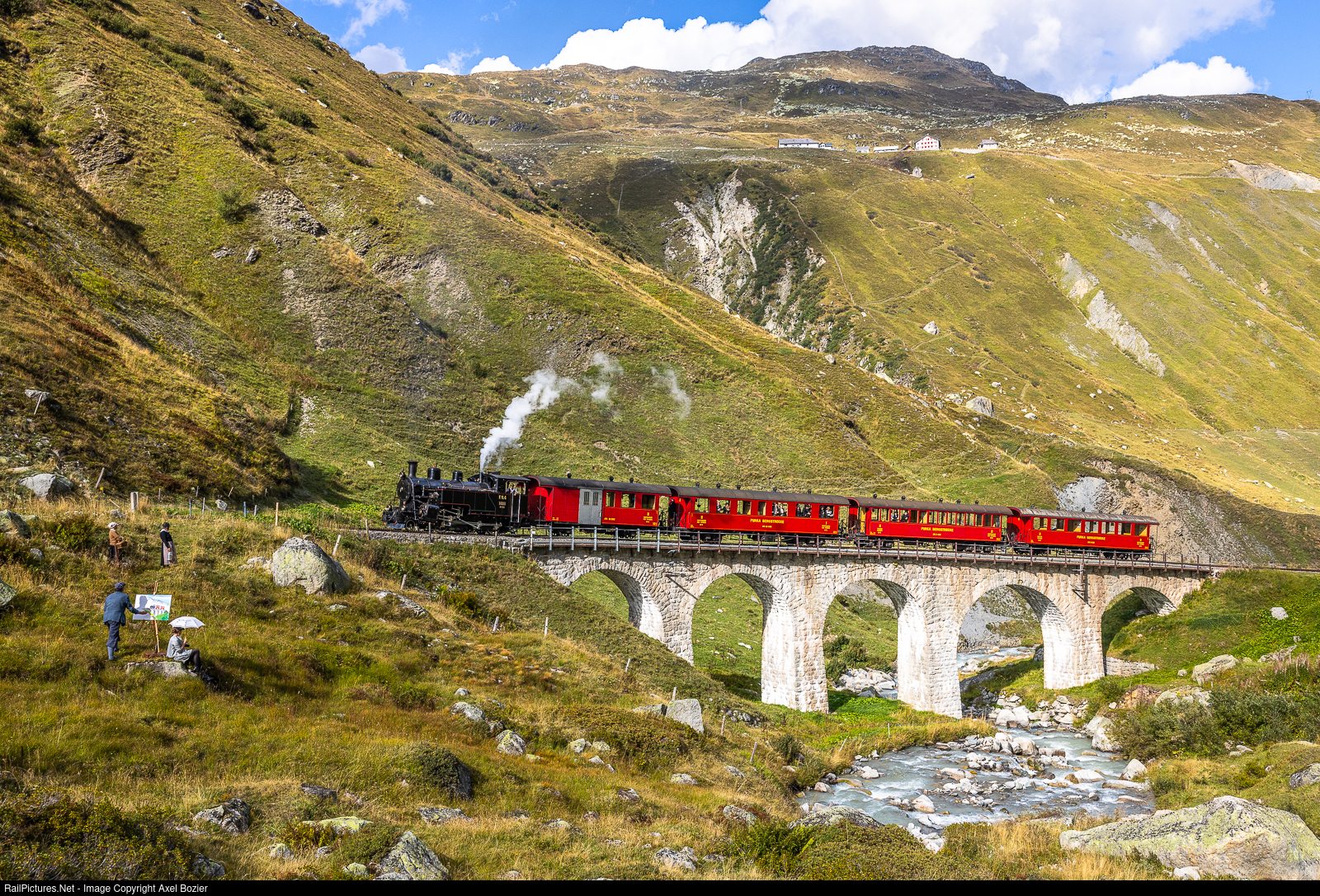 | A timeless scene: cogwheel steam locomotive HG 3/4 #4 of the Dampfbahn Furka-Bergstrecke (DFB), built by SLM in 1913, with its passenger train is crossing the Steinstafel viaduct. Note the people in period clothing, especially the painter at work! |