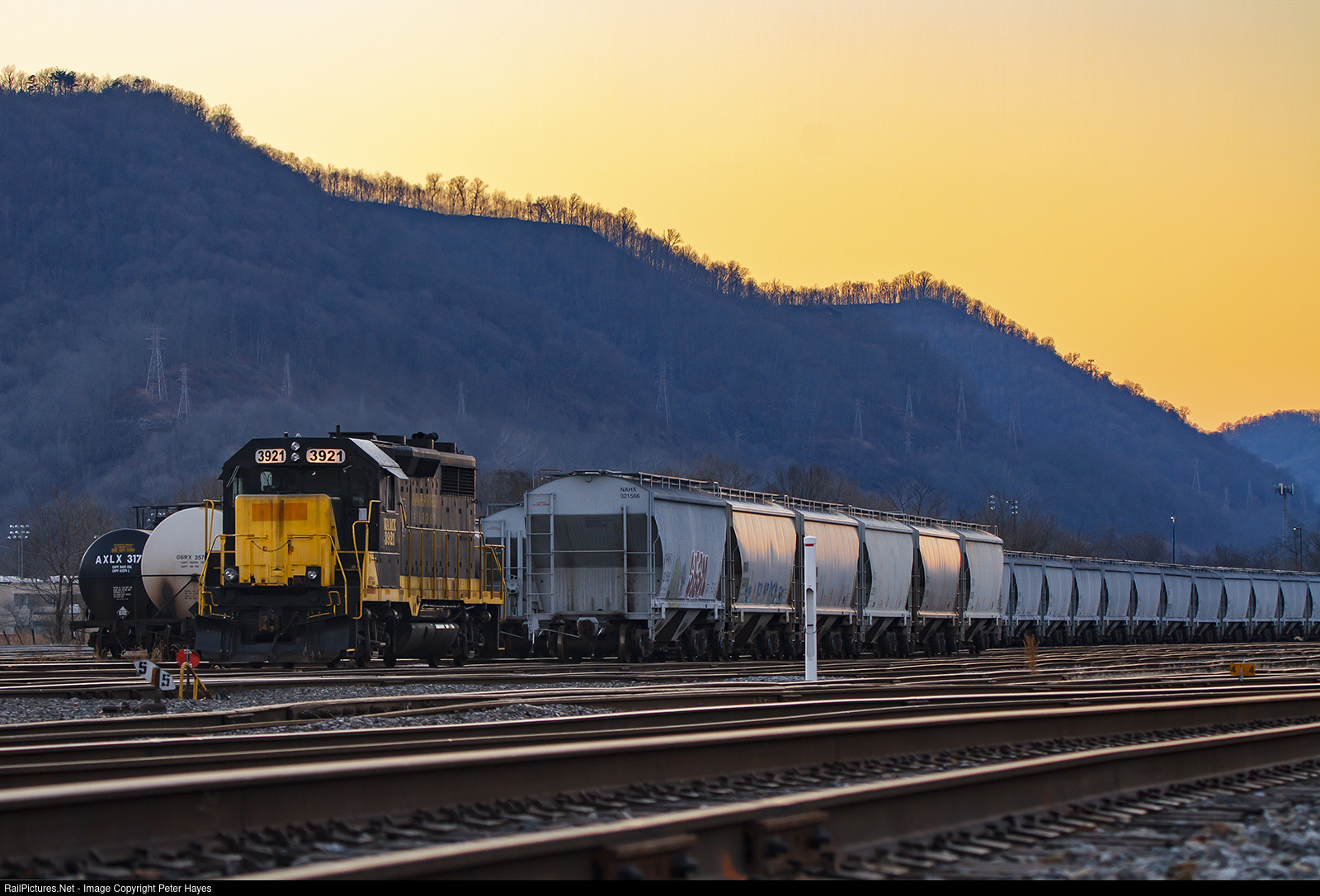 | The mountains are still glowing as the sun sinks lower behind them, while WAMX 3921 waits for its next job in Dickinson Yard. The former Western Maryland GP35 may not be on its home rails, but it no doubt saw service in West Virginia countless times under its original owner. |