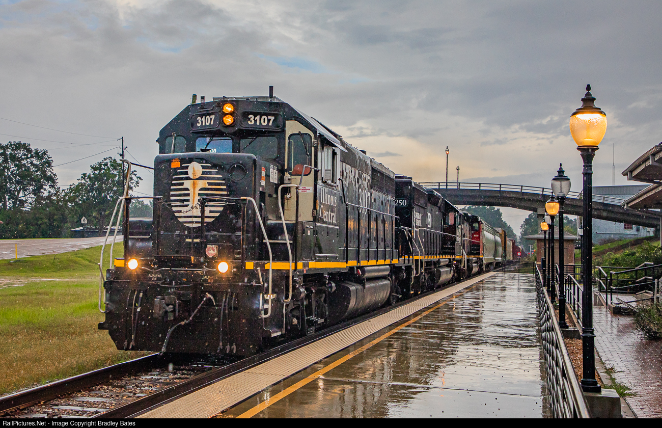 | Canadian National local L562 heads back north to Jackson as they pass through Hazlehurst, MS., during a heavy T-Storm with Illinois Central GP40-2R #3107 leading SD40-3 #6250 |
