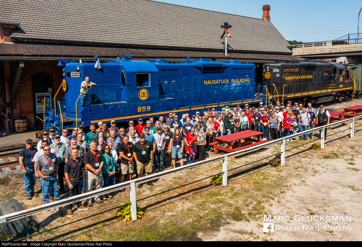 Coming Together. As part of the Heritage Rail Alliance (HRA) 2022 Conference, the group visited the Railroad Museum of New England (RMNE) in Thomaston, Connecticut. The recently overhauled NAUG 859 (née-NW 859, GP9, 6/1959) made its public debut to pair with NAUG 686 (née-NW 686, GP9, 3/1959) on a special excursion train. The group took a minute to pose in front of the former New Haven Railroad Thomaston Station, one of the RMNE’s first projects. The HRA is comprised of rail oriented museums/operations that are for the benefit of the public, facilitates the exchange of resources and information between the organizations, and during this conference they visited serval locations in Connecticut, including Valley Railroad, Connecticut Trolley Museum, Shore Line Trolley Museum, an Danbury Railroad Museum.