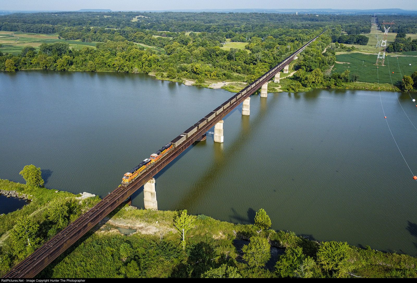 | On the morning of September 15, 2022, a southbound coal train soars over the Arkansas River just north of Spiro, OK. |