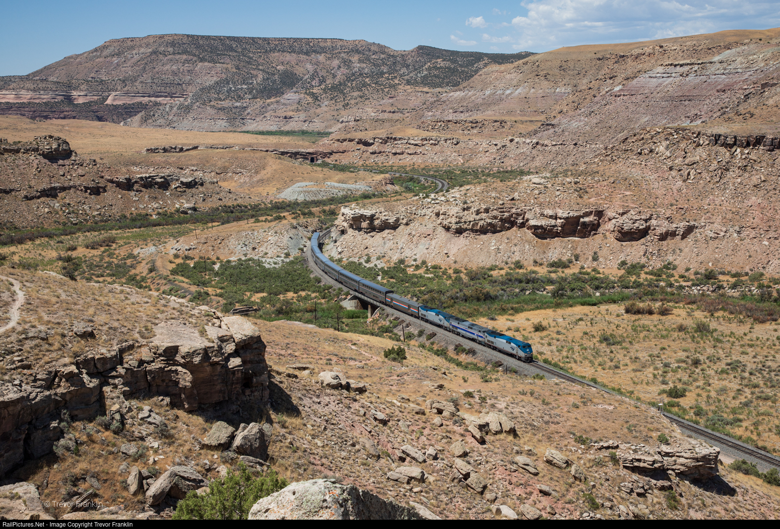 | Running a little behind schedule in the mid-day heat, #6 cruises over Salt Creek leaving the Colorado River and Ruby Canyon behind. The right of way now cuts through the impressive geology at this location with the much sharper prior alignment seen off to the left with the old code-line poles still standing guard. |
