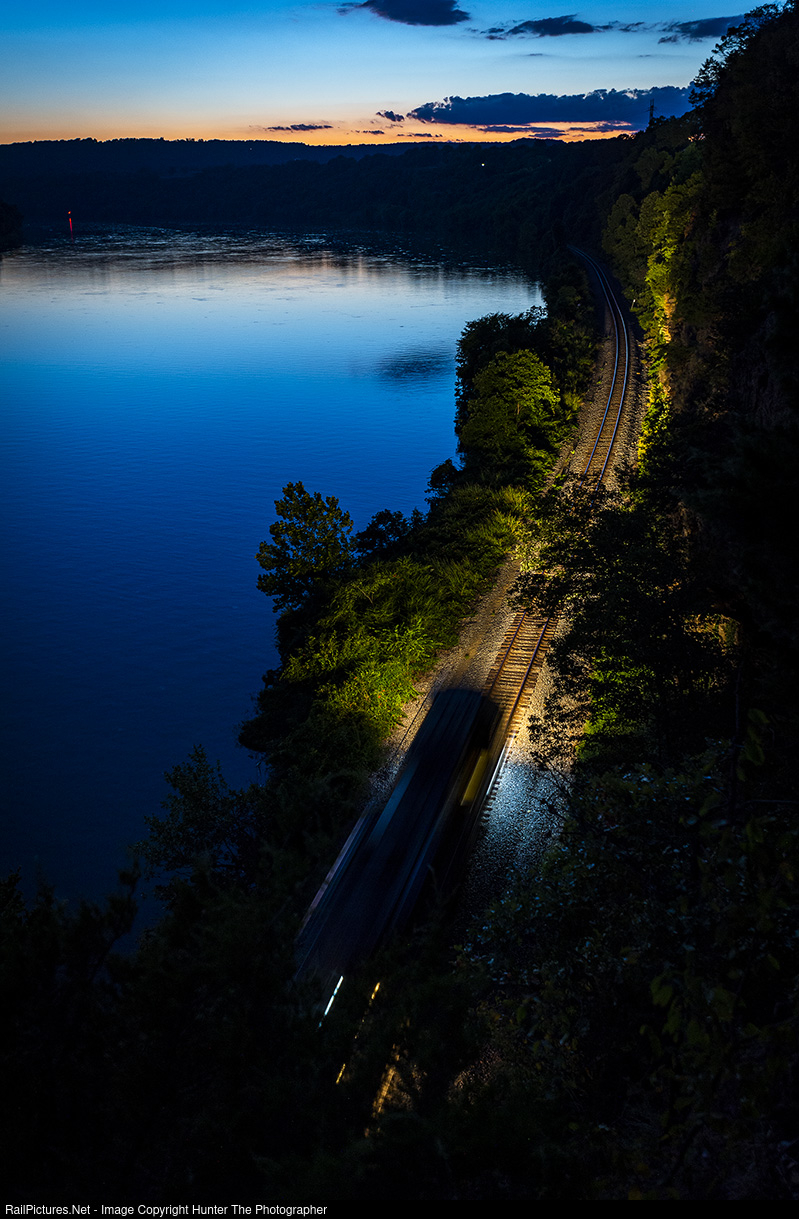 Daylight fades as a northbound manifest train cruises below the riverside bluffs of Ozark, AR on a pleasant September 17, 2022 evening.