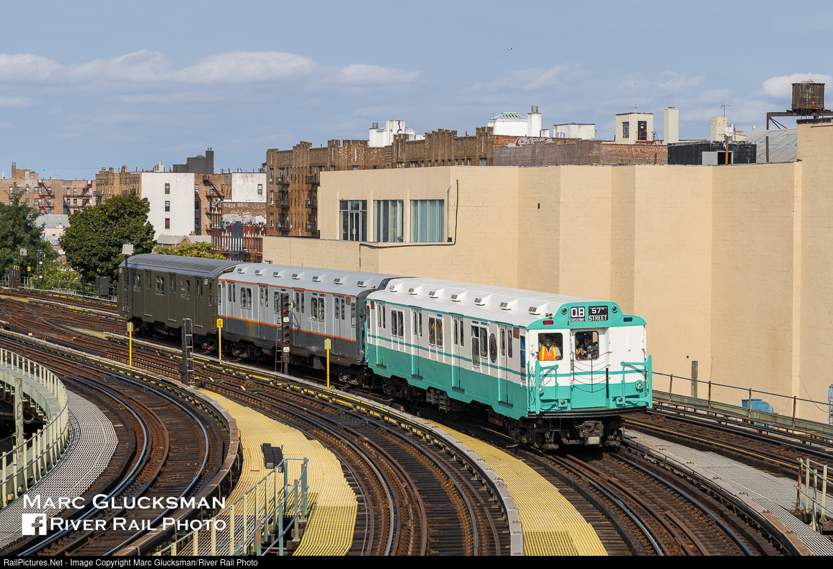 | Bright White. The recently restored R-10 3189 (ACF, 1948) led a short 3 car set to make its debut at the New York Transit Museum Parade Of Trains on Saturday, September 17, 2022. This car had been in the 207 Street Shop for 5 years undergoing restoration and repainting. It wears the blue and white paint scheme of the 1964-65 Worlds Fair that was applied to some R-10s during that era. |
