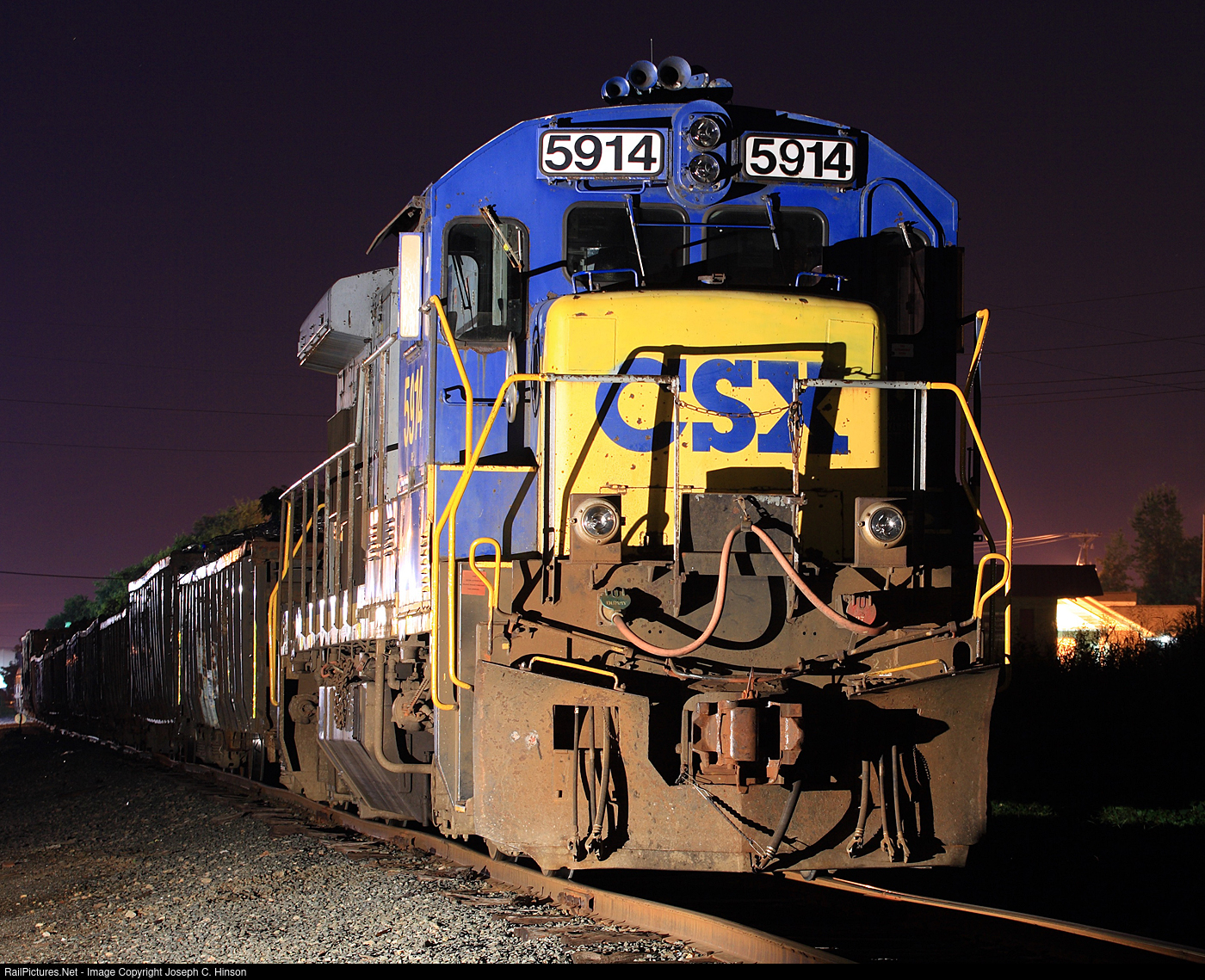 | CSX 5918 and hertrain wait for a crew that will not ome until daylight. She was built for CSX predecessor line Seaboard System in 1985 ad was retired by CSX shortly after this photograph was made. |