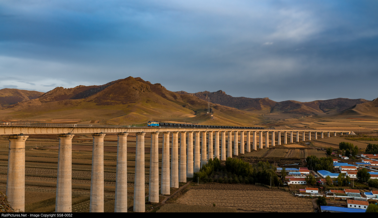 | This photo was taken in Sûbrag Town, Bairin Right Banner of Inner Mongolia. In the late autumn, a train loaded with coal was passing through a bridge above Bagentu Village. |