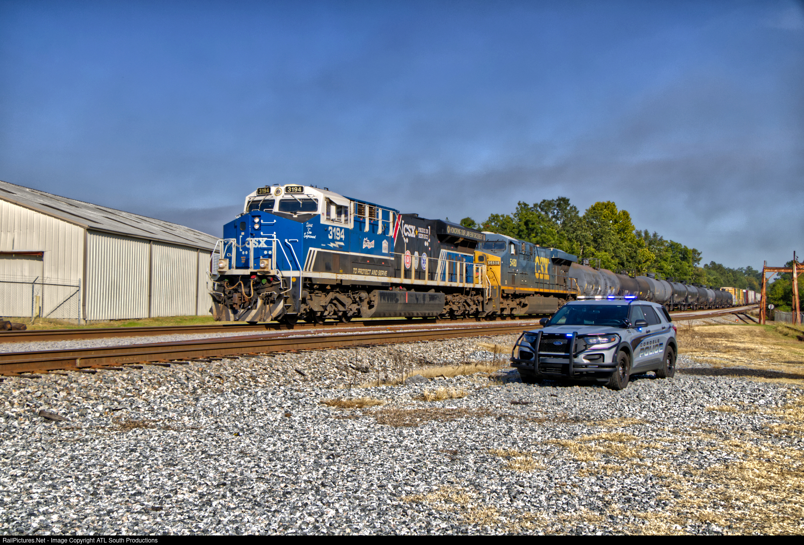 | "Law Enforcement Leslie". Having snuck in the previous night on M606, CSX 3194 "Spirit of Law Enforcement" brings CSX M648-24 into Cordele, GA. Special thanks to the Cordele Police Department for sending an officer to pose their vehicle next to the 3194. |
