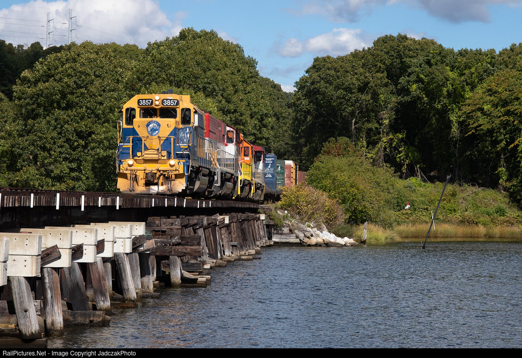| NECR 3857, the only current operable blue and gold on the property, leads train 608 south to New London along the Thames River. |