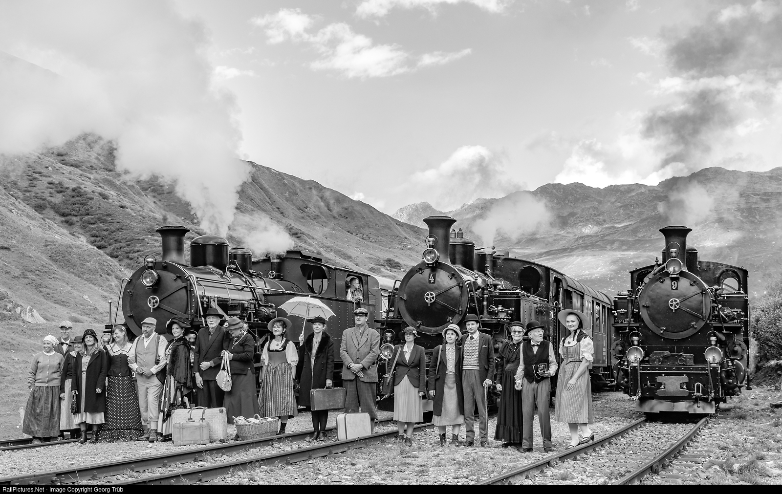 Once upon a time in Tiefenbach, with cogwheel steamlocomotives HG 4/4 # 704, HG 3/4 # 4 and # 9 of the Dampfbahn Furka Bergstrecke. Background actors joined for a group photo in front of the three locomotives.