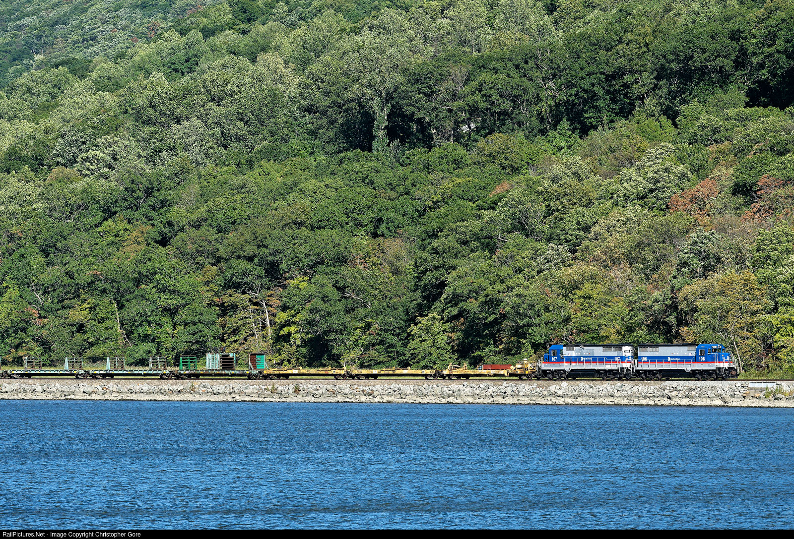 Empty Metro-North rail train heading south along the Hudson River with GP35R 106 and 107.